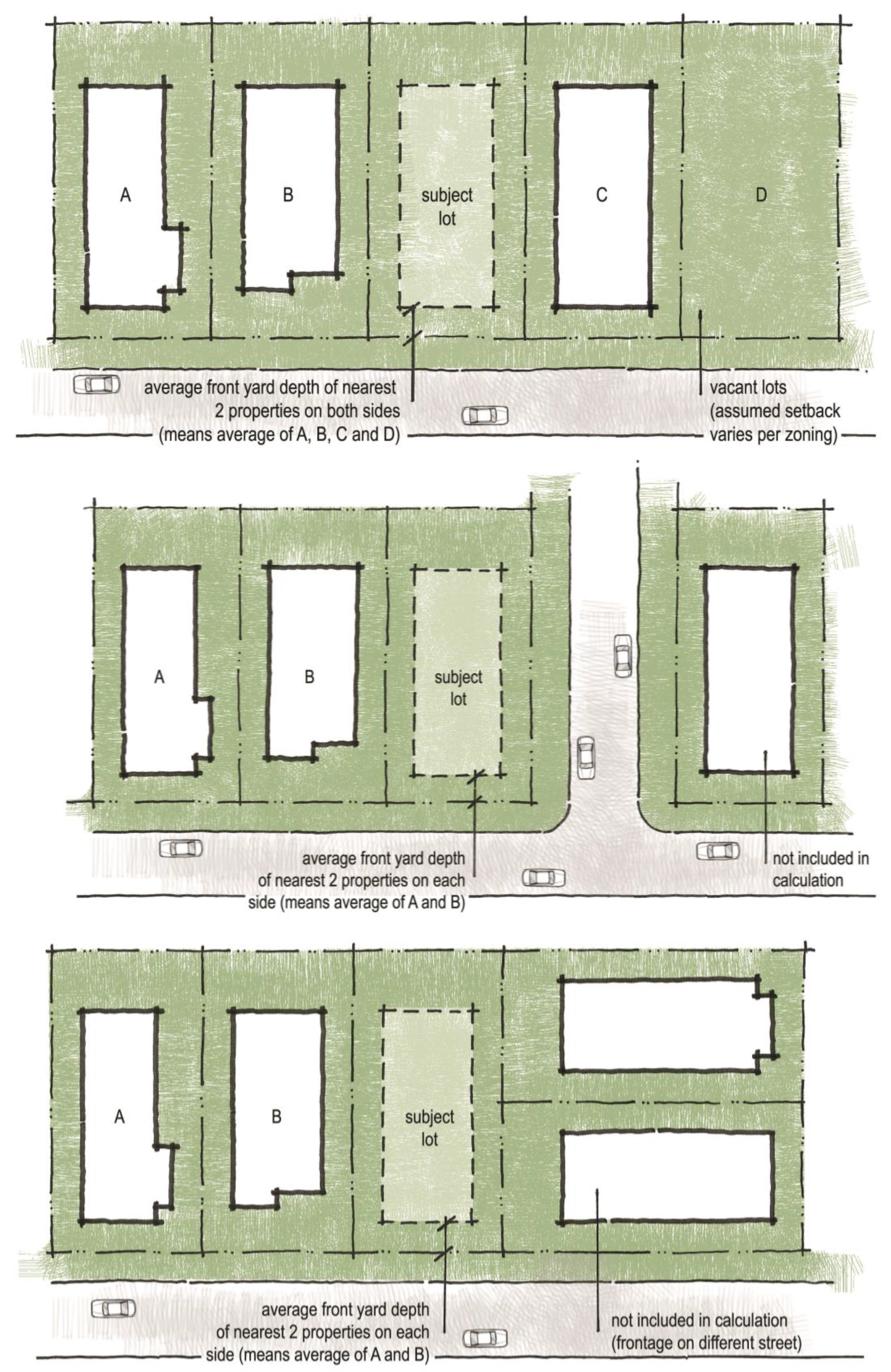 Front Yard Averaging, Residential. When existing lawfully established residential buildings on one or more abutting lots are closer to the front property line than the otherwise required front yard, additions to existing residential buildings or construction of new residential buildings on the subject lot may comply with the average front yard depth that exists on the nearest two lots on either side of the subject lot in lieu of complying with the zoning district's minimum front yard requirement.