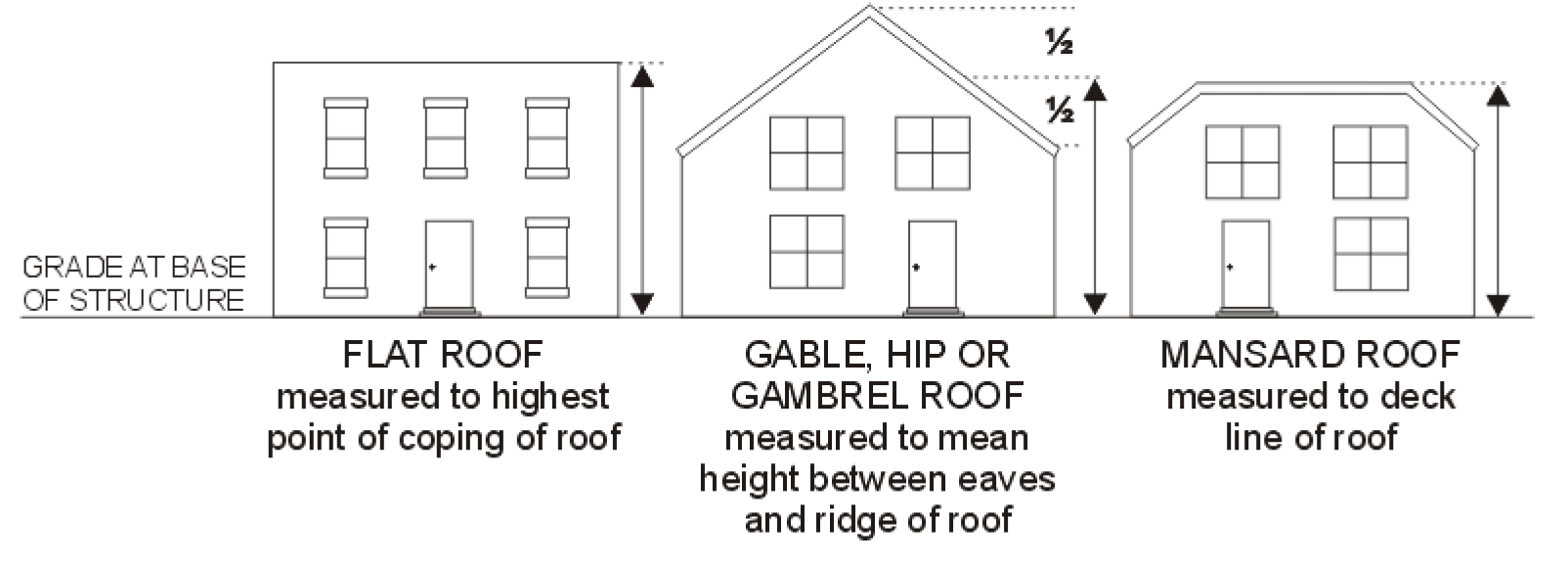 Building. Building height is measured as the vertical distance from average finished grade to the highest point of any flat roof, or to the deck line of a mansard roof, or to the mean height between the plate and the ridge of a gable or hip roof.