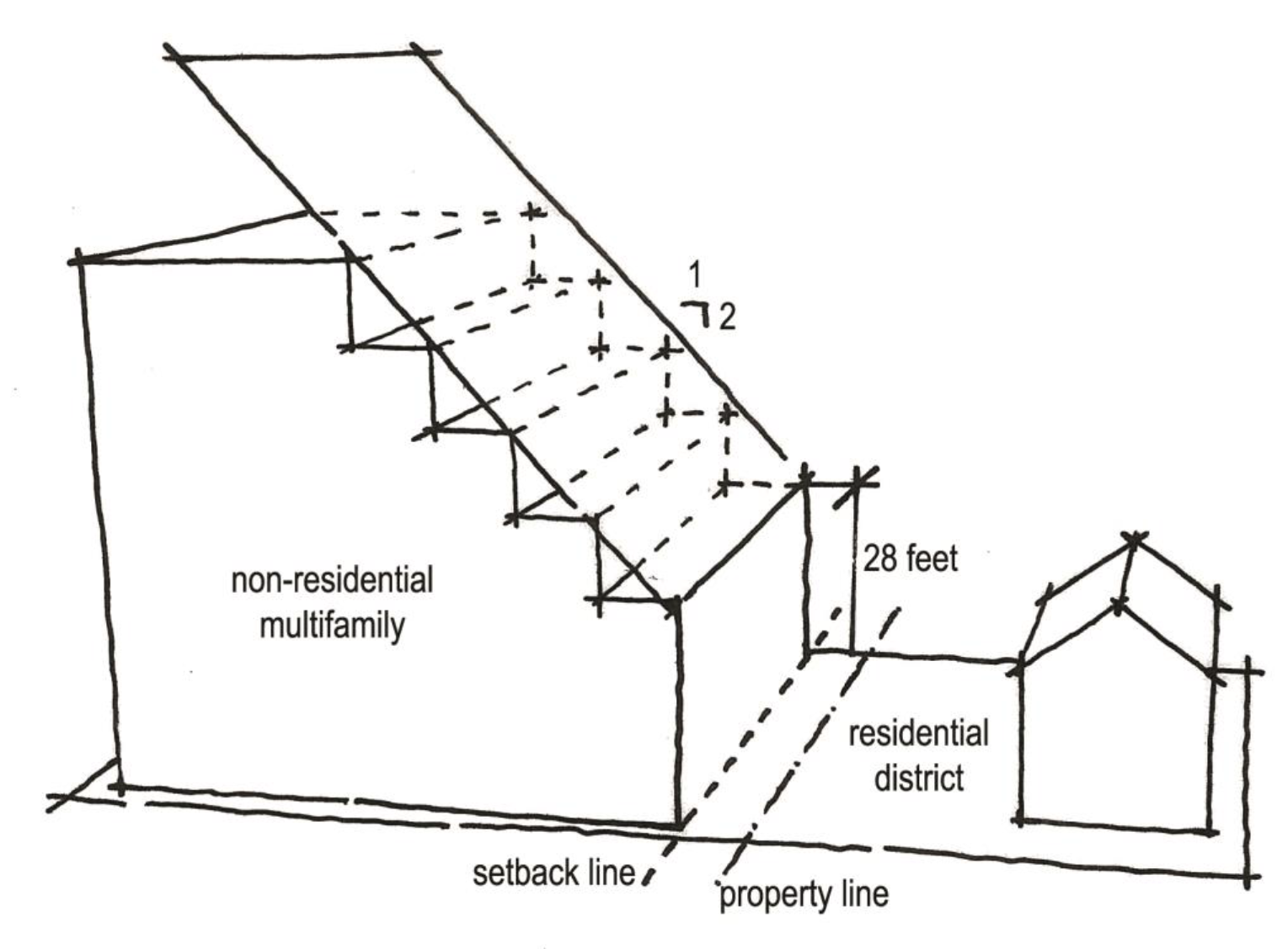 Exception, Upper Floor Step-Back. For nonresidential or multifamily building development on lots abutting residential districts that have a maximum allowed building height of 35 feet, the maximum building height at the point of the required yard or setback line is 28 feet. Height may be increased above 28 feet by up to two feet (vertical) for each one foot of building setback or upper floor step-back.