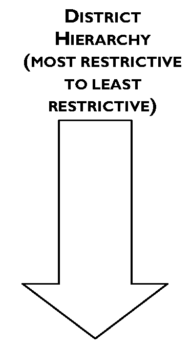 Under the hierarchy of zoning districts established by this Chapter, the RS-12 district is the most restrictive general zoning district and the H-I district is the least restrictive general zoning district. Overlay and planned districts are not included in the zoning district hierarchy.