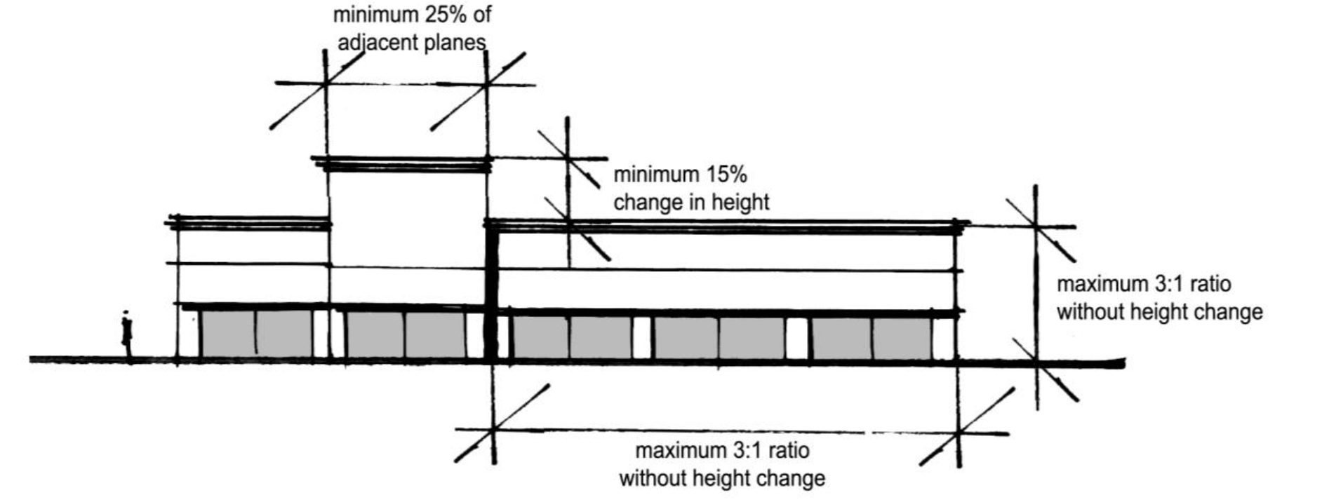 No horizontal wall section shall extend for a distance greater than three times its height without a change in elevation of a minimum of 15 percent of such height. This height change shall continue for a minimum of 25 percent of the length of either adjacent plane.