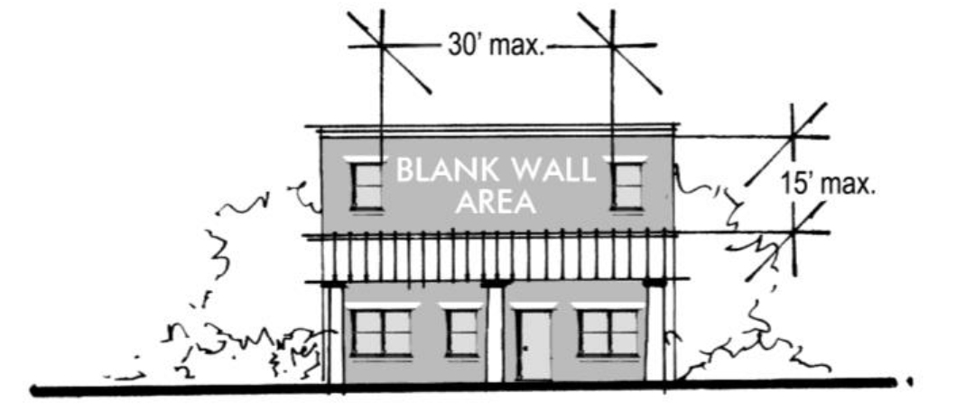 Blank Wall Area. Blank wall areas on building façades facing public right-of-way shall extend a maximum of 15 feet in the vertical direction or 30 feet in the horizontal direction.