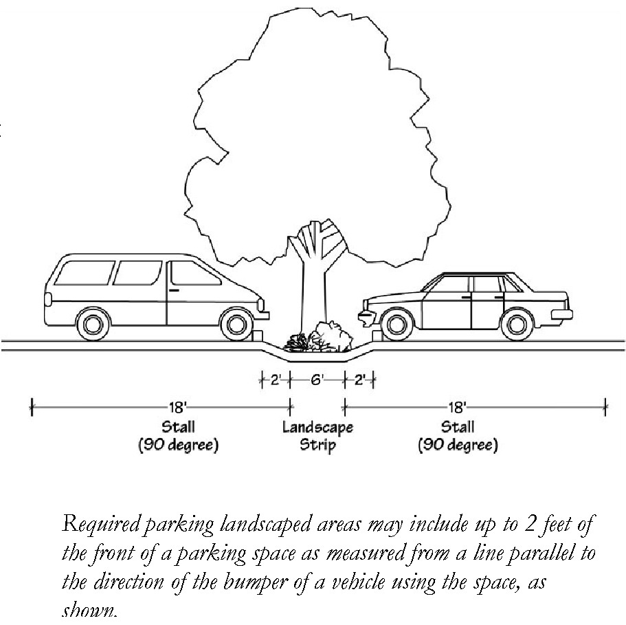 A landscaped area may include up to 2 feet of the front of the parking space as measured from a line parallel to the direction of the bumper of a vehicle using the space, as shown at right. The landscape strip shall be a minimum of 6 feet in width.