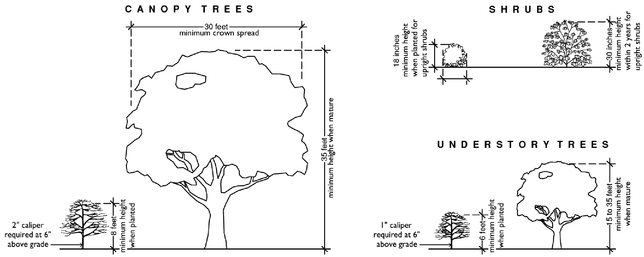 Understory (Small) Trees: Understory trees must be a minimum of 6 feet high and 1-inch in caliper, measured 6 inches above grade when planted. When mature, understory trees should have an expected height of 15 to 35 feet.