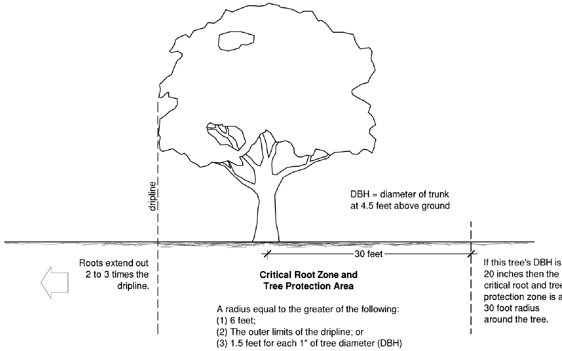 Where grading within a tree dripline cannot be avoided, cut and fill shall be limited to ¼ to ½ of the area within the dripline, and tree roots must be pruned with clean cuts at the edge of the disturbed area. (No fill shall be placed within the dripline of a tree without venting to allow air and water to reach the roots.)