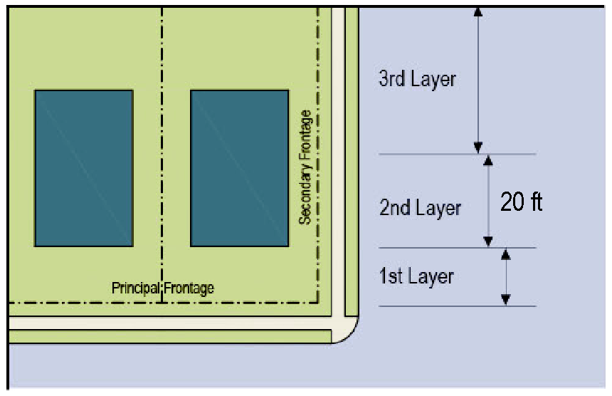 The use of alleys to access the rear of properties is strongly encouraged., A minimum separation of ten (10) feet between adjacent property lines and the alley intersection is required. A forty (40) feet separation is required between alleys and the intersection of streets.