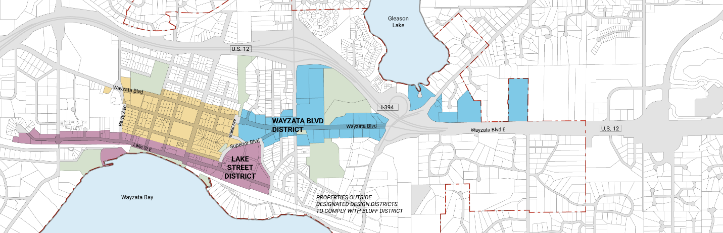 The Design Standards apply in three "Design Districts" in the City that are established according to location and use: Lake Street District; Bluff District; and Wayzata Boulevard District. Each Design District (or "District") shall be set forth in the Zoning Map according to delineations in the following summary and in coordination with the following Design District Map: