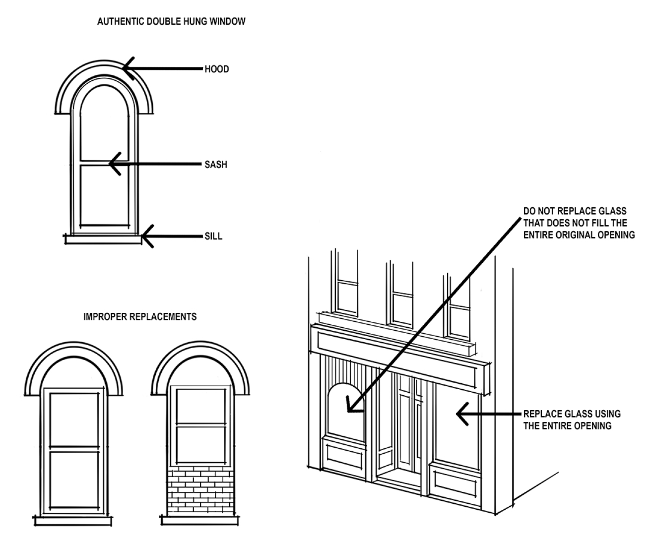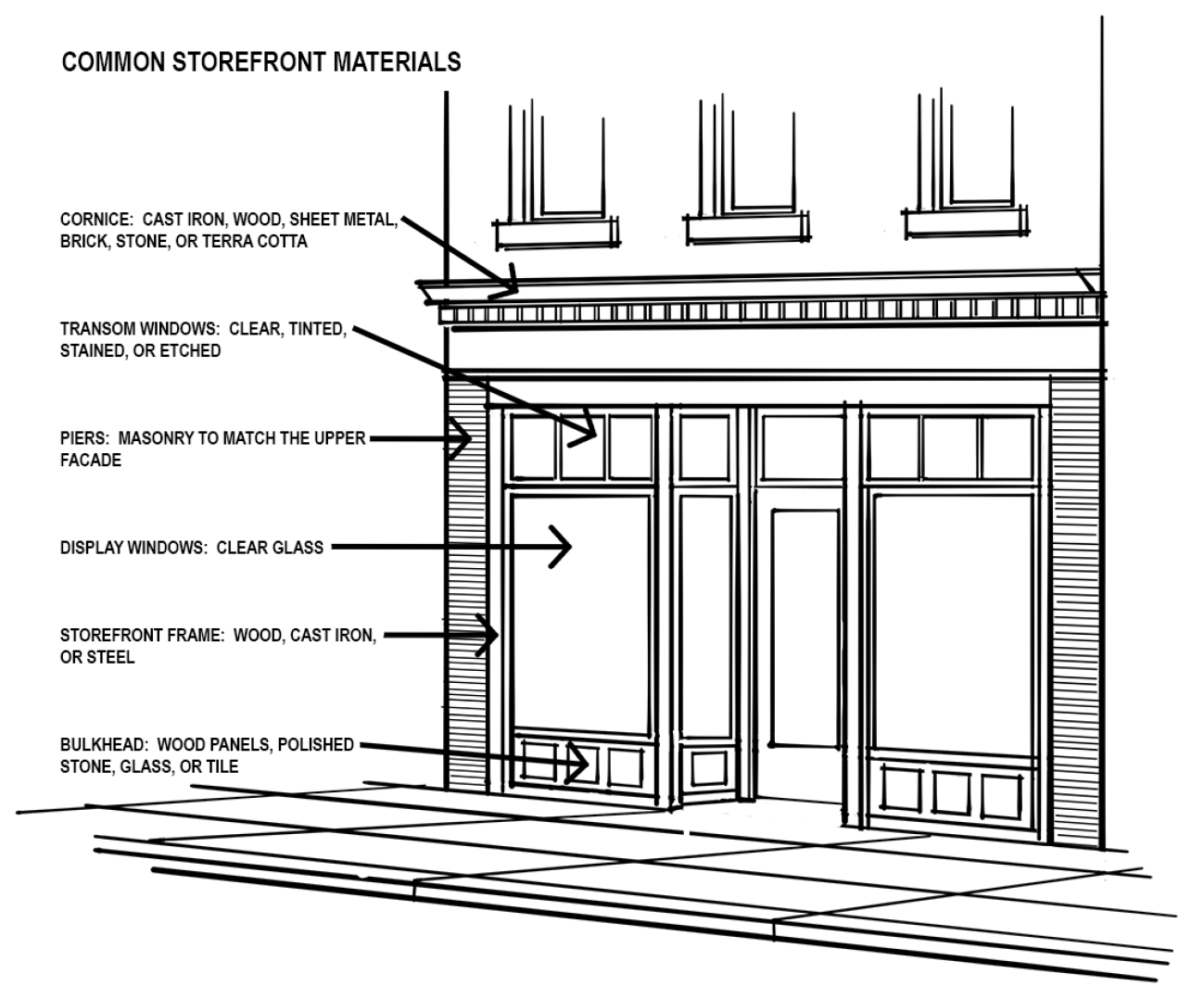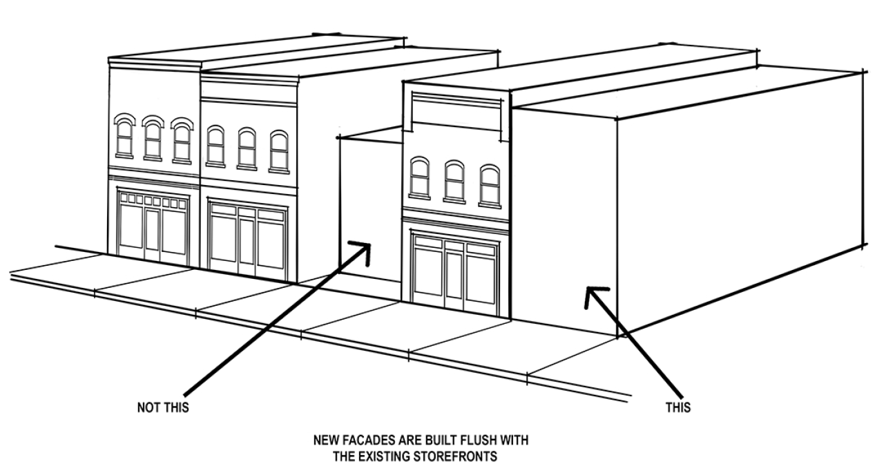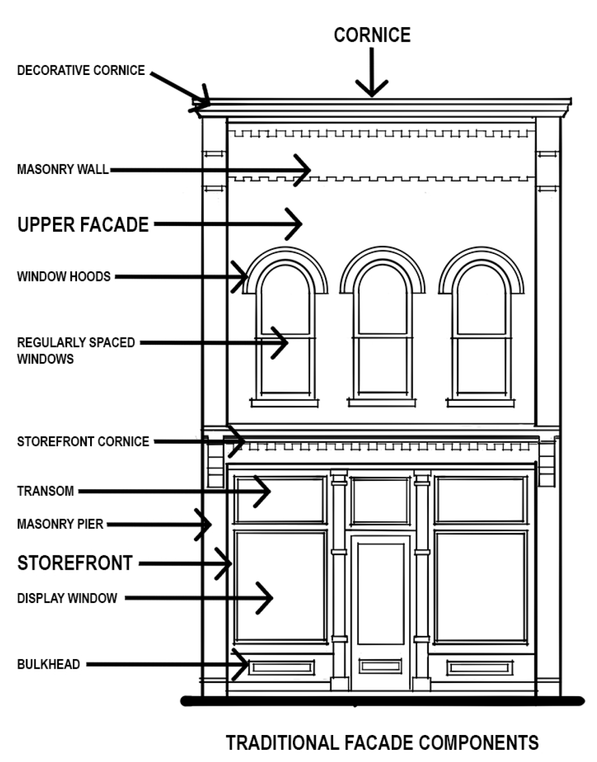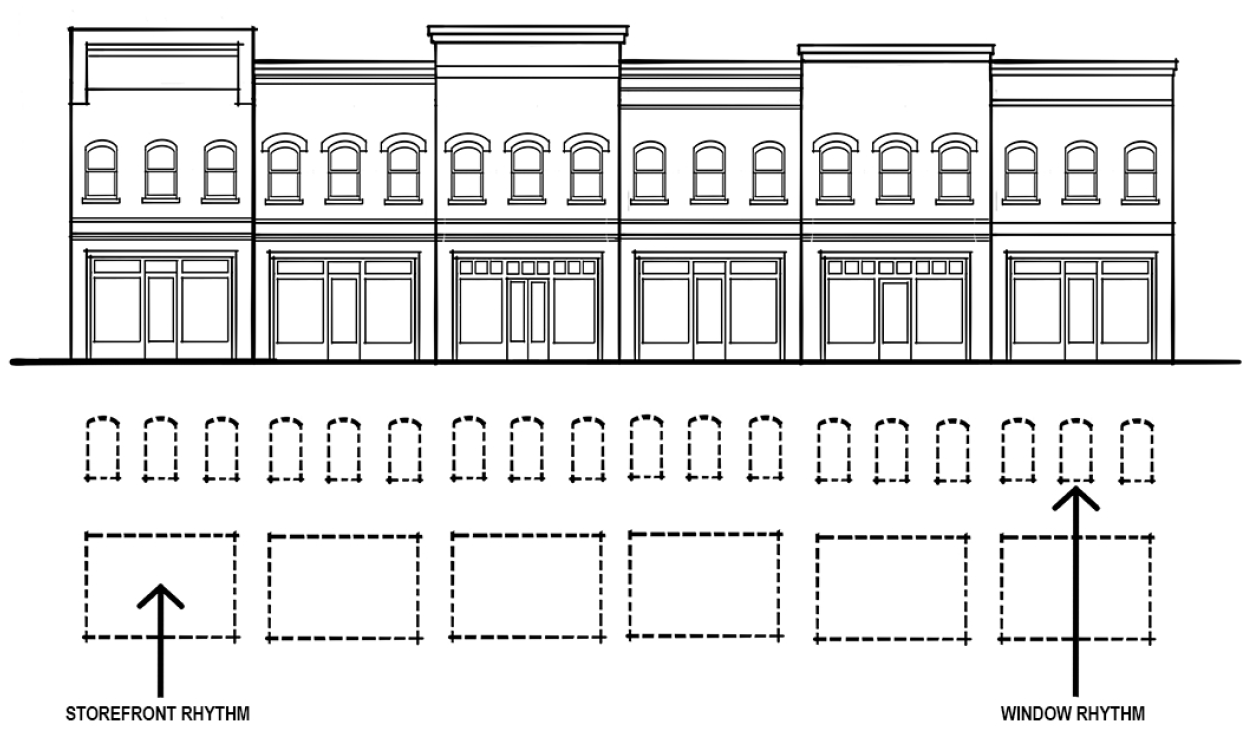Buildings having primary facades wider than 60 feet shall be designed to reduce apparent mass by dividing the primary facade into a series of smaller components. No individual component shall have a length of more than 60 feet. Components shall be distinguished from one another through two or more of the following:
