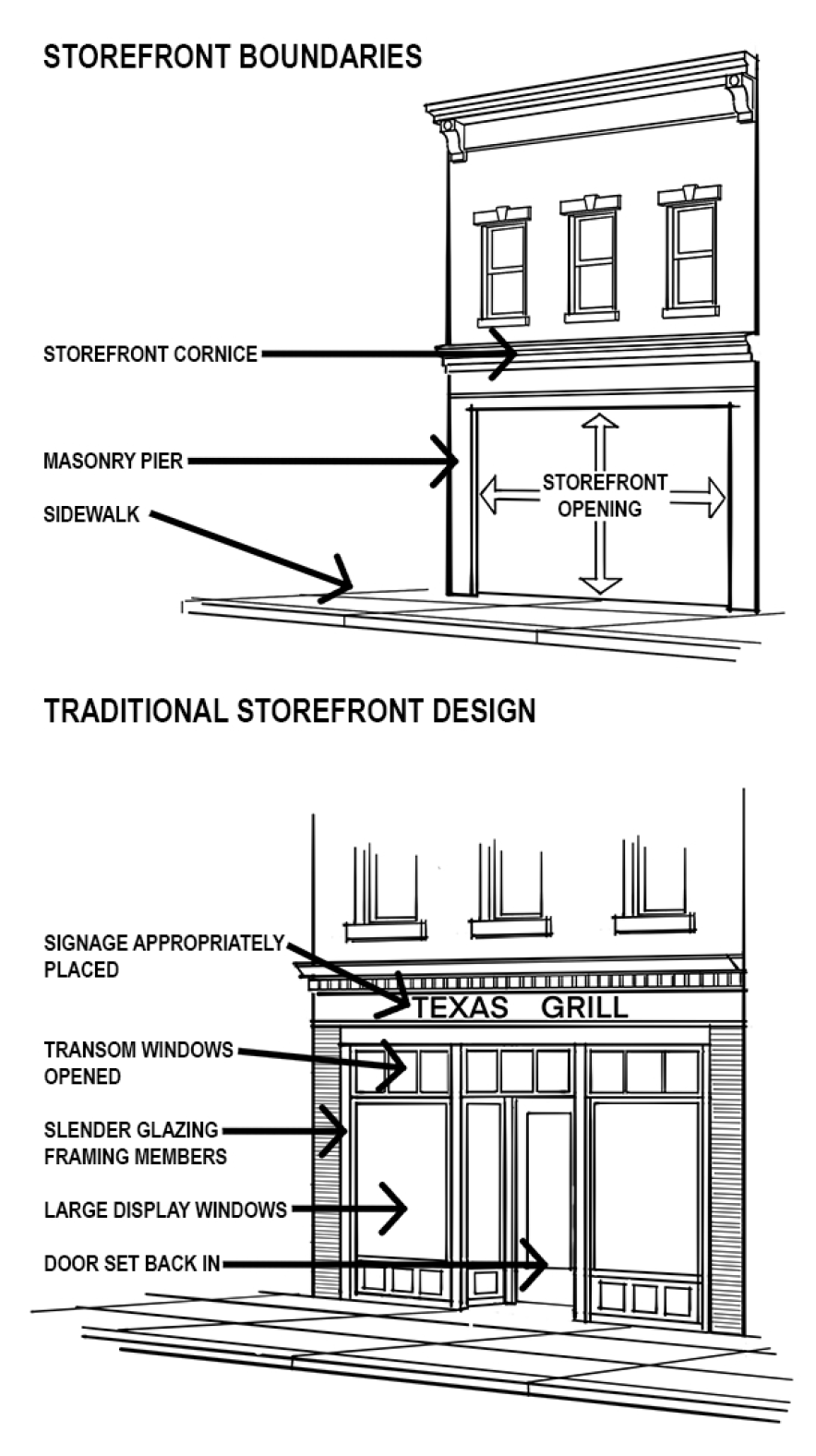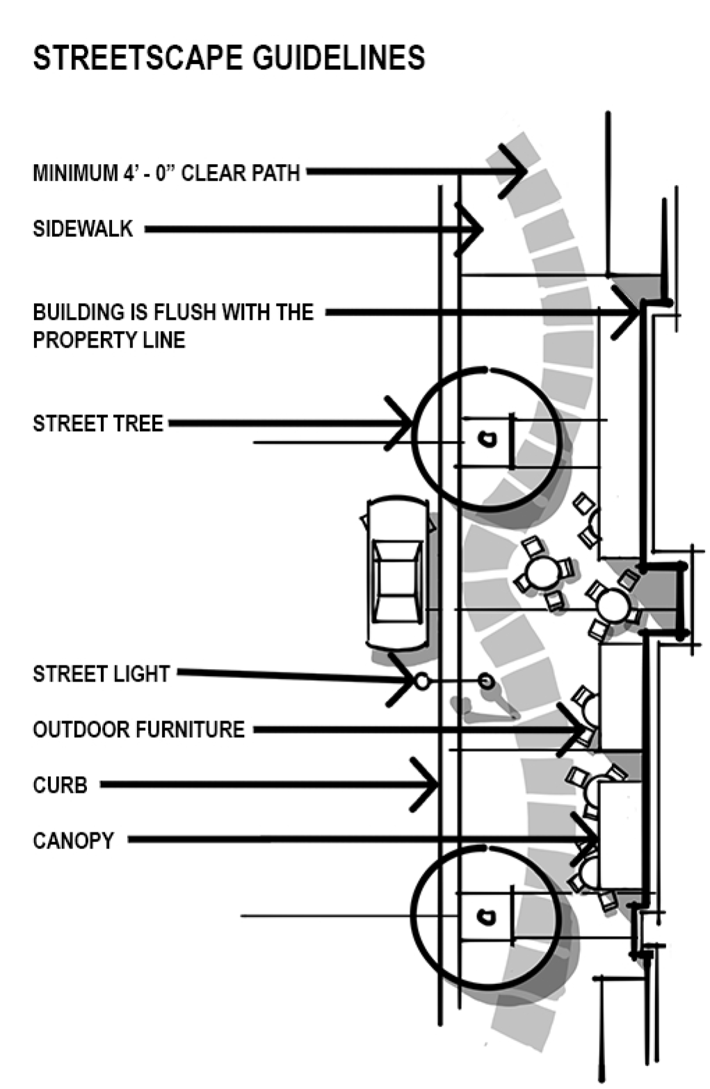 Street screens may include breaks to provide pedestrian access from any surface parking or service area to the public sidewalk.