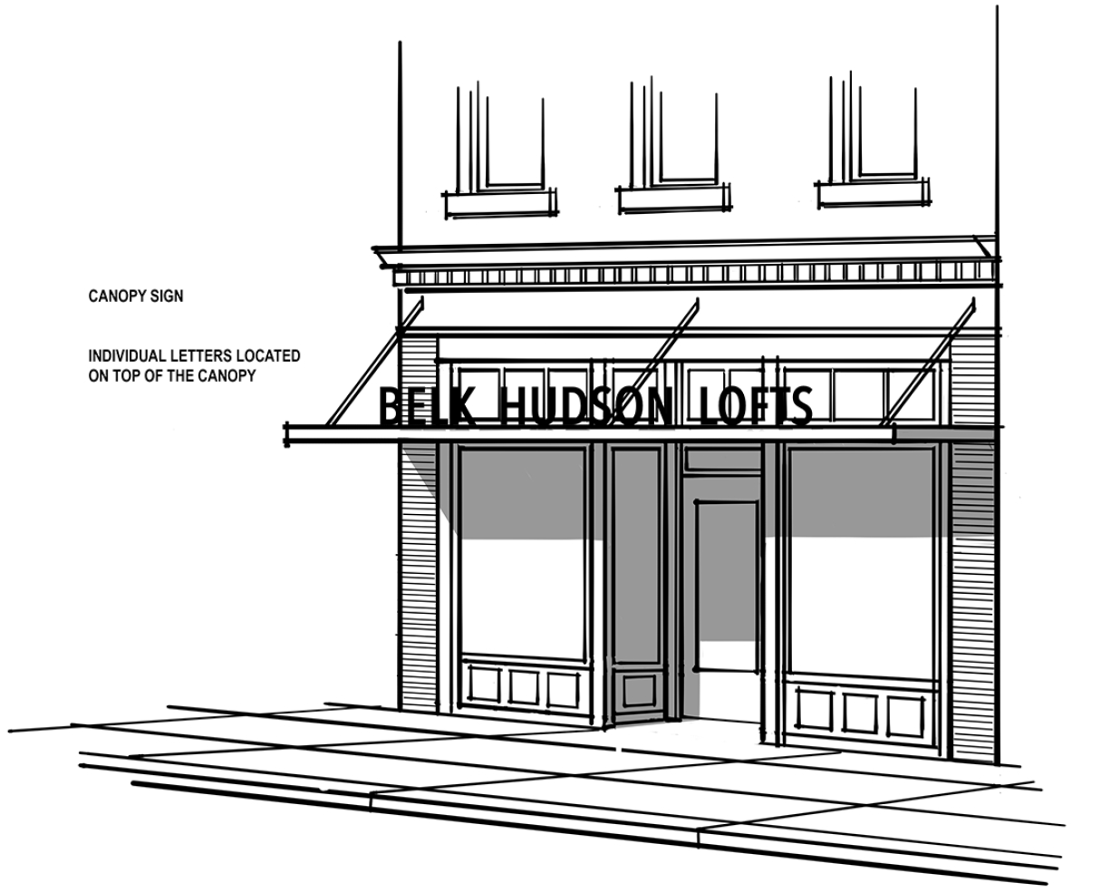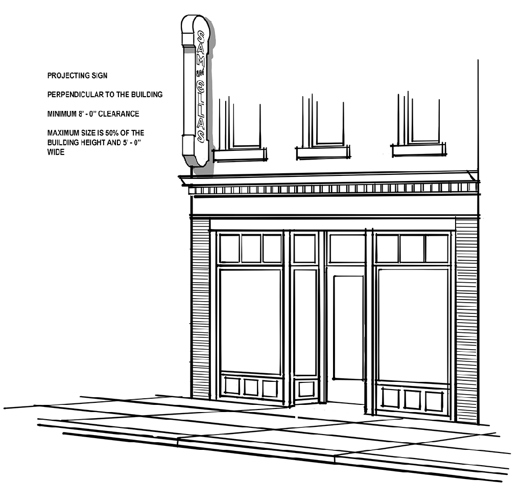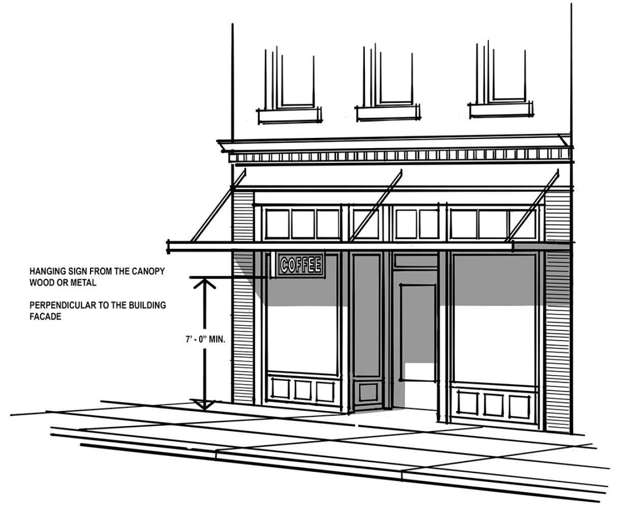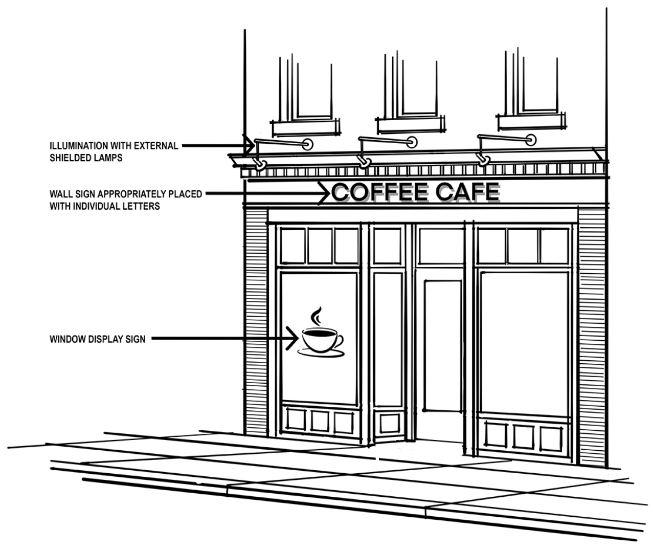 A shared monument and pole sign is encouraged for redevelopment or revitalization and required for new development. Materials must be consistent with main structures.