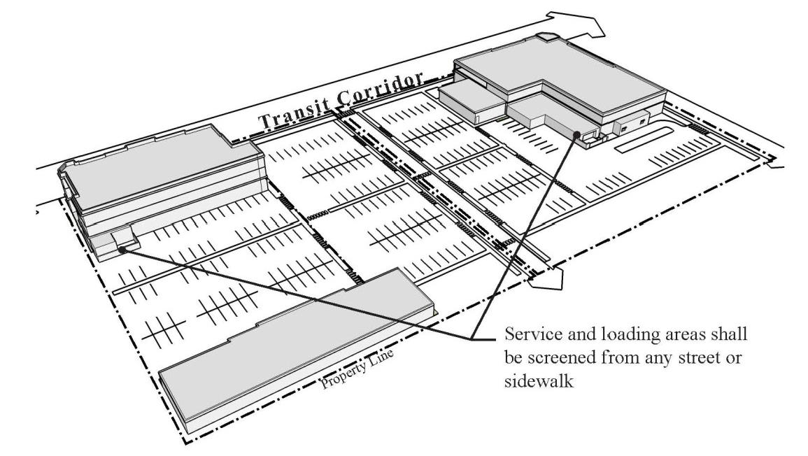 Loading docks, truck parking, outdoor storage, utility meters, HVAC equipment, trash dumpsters, trash compactors, and other service functions shall not be visible from any street or sidewalk or adjacent residential area as illustrated in figure 1. These facilities may be incorporated into the overall design of the principal building using screening walls of compatible material, style, color, texture, pattern, trim, and details whether these service functions are attached or detached from the principal building.
