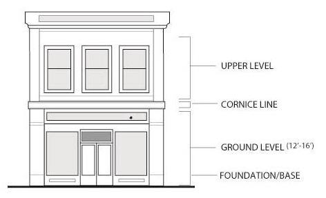 Building façade. Buildings shall provide a foundation or base, typically from ground to bottom of the lower windowsills, with changes in volume or material as illustrated in figure 2. A clear visual division shall be maintained between the ground level floor and upper floors with either a cornice line or awning from 12 feet to 16 feet above base floor elevation or grade, whichever applies to the proposed development.