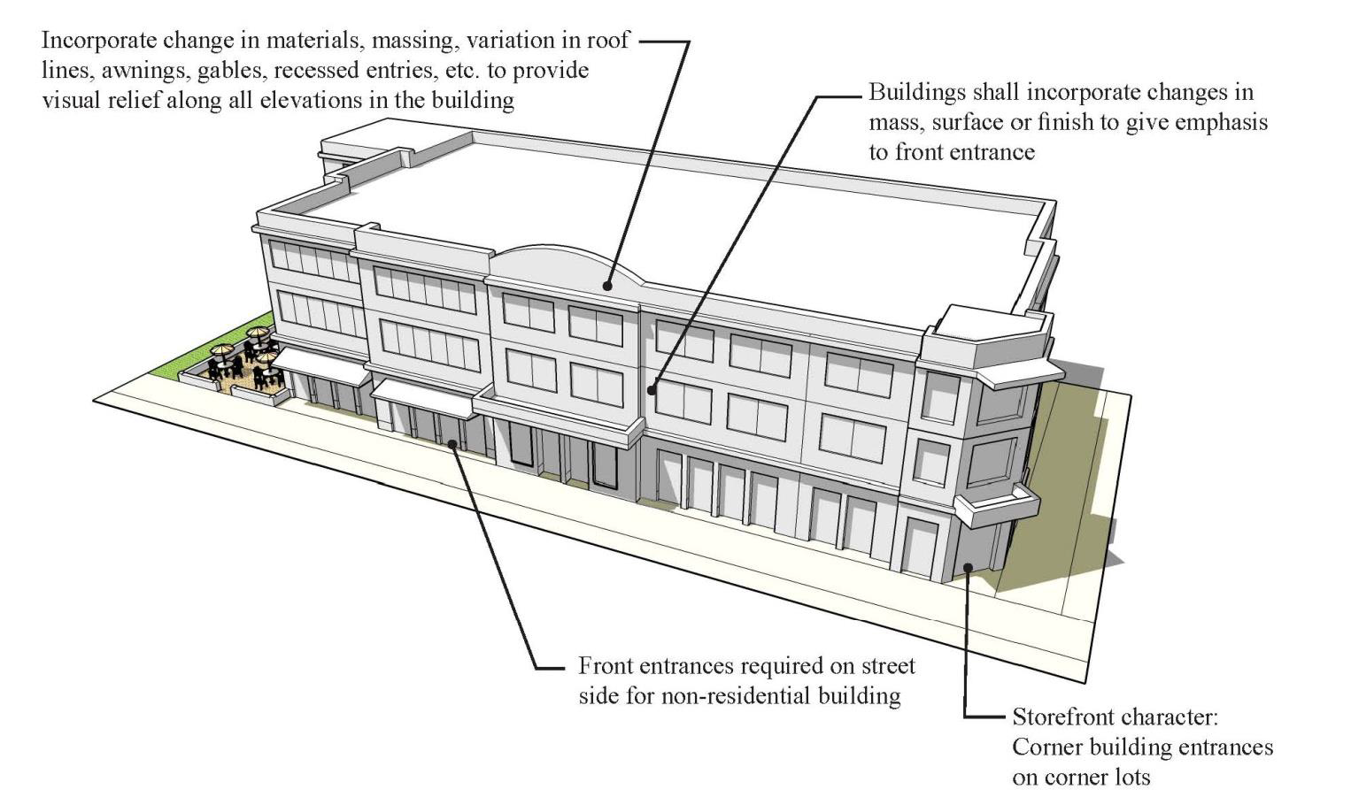 All buildings excluding single-family detached homes shall utilize at least three of the following design features to provide visual relief along all elevations of the building as illustrated in figure 3: