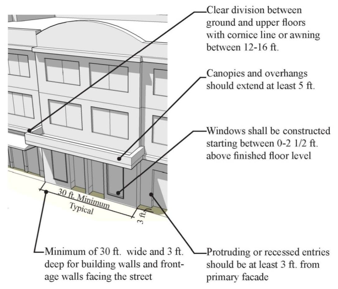 Commercial and mixed-use buildings shall express a "storefront character" as illustrated in figure 4. This guideline is met by providing all of the following architectural features along the street building frontage as applicable: