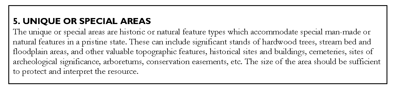 Passive Open Space (Unimproved): Up to 75 percent of the park, recreation, and open space lands shall be provided for passive recreation purposes such as walking, jogging, relaxation, etc. Preservation of cultural or natural resources such as steep slopes, rock outcroppings, mature woodlands or water resources may also be counted towards passive recreation provided there is access for public enjoyment and appreciation of such resources.