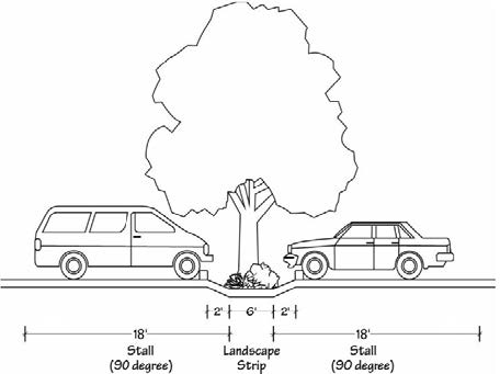 A landscaped area may include up to two feet of the front of the parking space as measured from a line parallel to the direction of the bumper of a vehicle using the space, as shown at right. The landscape strip shall be a minimum of six feet in width.