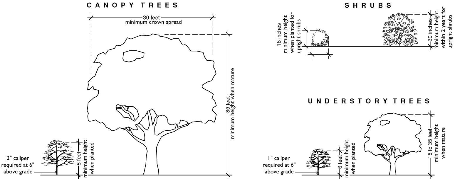 Understory (Small) Trees: Understory trees must be a minimum of six feet high and one-inch in caliper, measured six inches above grade when planted. When mature, understory trees should have an expected height of 15 to 35 feet.