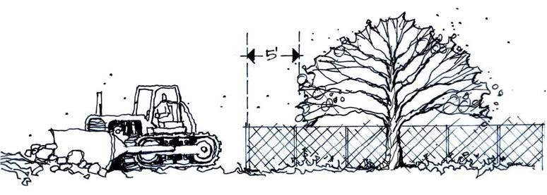 Construction traffic, storage of vehicles and materials, and grading shall not take place within the protective areas of the existing trees.