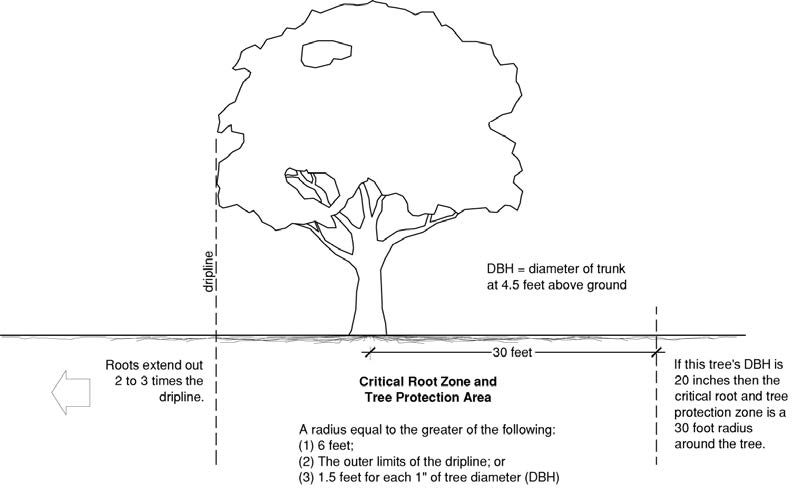 Land disturbance within a tree dripline is prohibited except for driveway access points, sidewalks, curb and gutter.