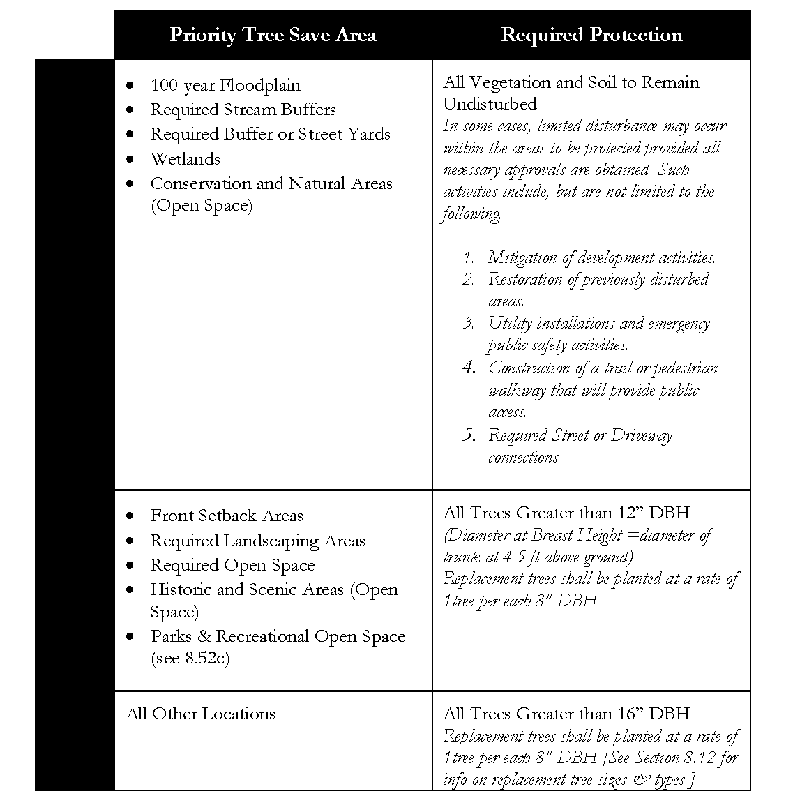 Required Tree Save Areas: Trees and existing vegetation shall be preserved in accordance with the table above. Exceptions shall be approved by the Administrator, who shall work jointly with the developer and design team during the project approval process. Surveyors should use a GPS device to flag trees for preservation or further study.