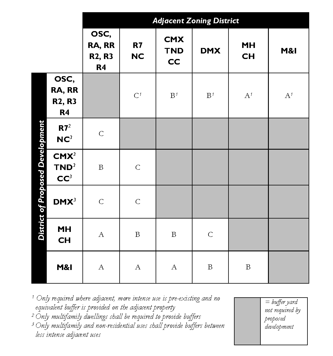 The size of a buffer shall be determined both by the zoning district of the proposed development and by the adjacent zoning district(s). Buffer yards shall be required in accordance with the table below when any use is being established on a property that abuts an existing developed lot or less intense zoning district.