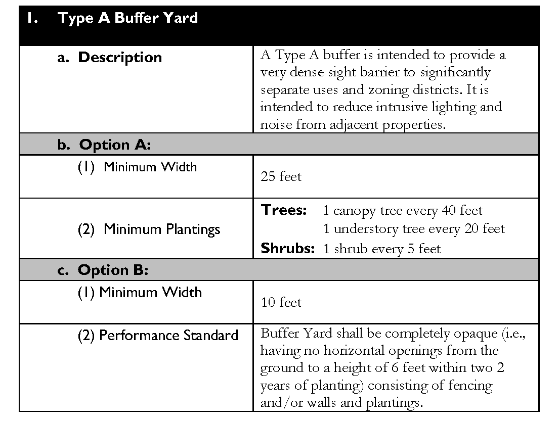 Minimum Planting: Semi-Opaque Screen from the ground to at least a height of 3.5 feet for screening of car lights and glare (minimum width: ten feet).