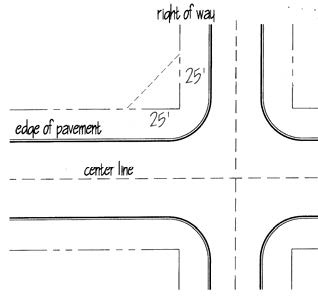 Sight Triangles: On a corner lot in any district, no planting, structure, fence, wall or obstruction to vision more than three feet in height measured from the edge of pavement shall be placed or maintained within the triangular area formed by the intersection of the street lines (right-of-way) and a straight line connecting points on said street lines, each of which is 25 feet distance from the point of intersection. In lieu of the 25' × 25' sight triangle, upon request by the applicant, the Administrator may also, where conditions warrant it, elect to require the standard NCDOT minimum sight triangle for a stop condition of 70 feet (along the existing right of way) and 10 feet (along the new right of way).