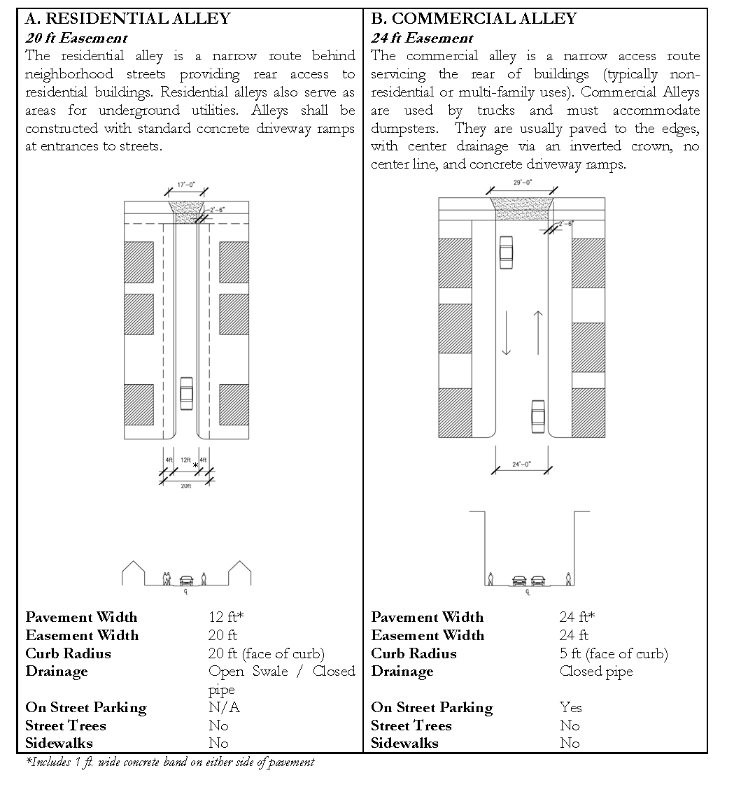For collector and arterial cross-sections, see Appendix C. The Town permits the use of the following street standards in accordance with the street hierarchy detailed as follows. NCDOT approval may also be required. (Note: All street widths shown are pavement widths only and do not include curb and gutter dimensions except in the case of alleys.)
