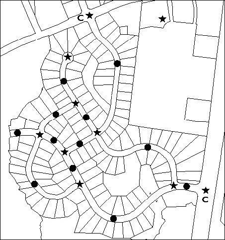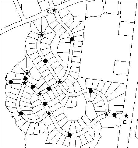 The illustration at right above illustrates a connectivity index of 1.44 (links are shown as circles, nodes are shown as stars, and connections to existing streets are shown as C's). The illustration has 11 links, two connections, and nine nodes for an index of (11+2)/9=1.44. In the illustration at right below, one cul-de-sac is converted to a full intersection. This gives the development one additional link for a connectivity index of 1.55 ([12 links + 2 connections]/9 nodes). The same number of lots is shown in both illustrations.