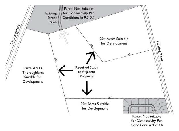 Where the conditions listed in Section 9.7.E, Cul-de-Sacs (below) would prevent connections, the adjacent property shall not be included in the calculation of required stubs.