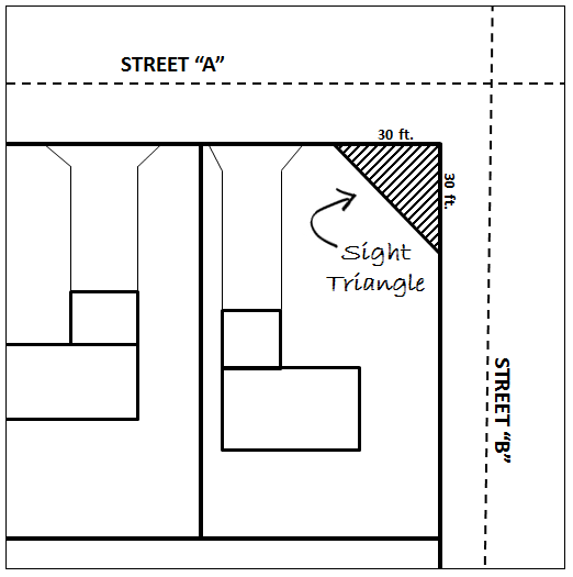 Sight distance triangle means the triangle area of a corner lot bounded by the right-of-way lines and a line connecting the two points on the property lines 30 feet from the intersection of the property lines.