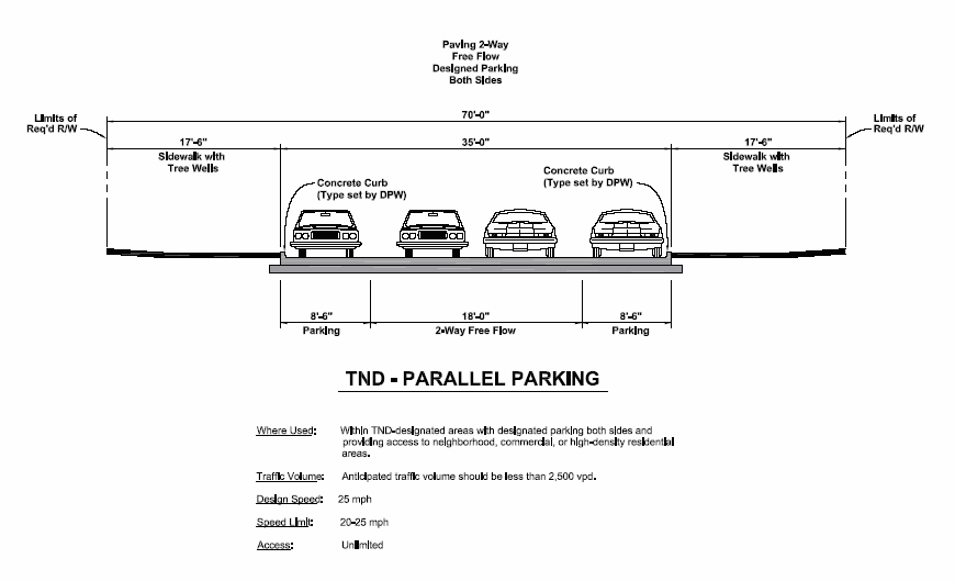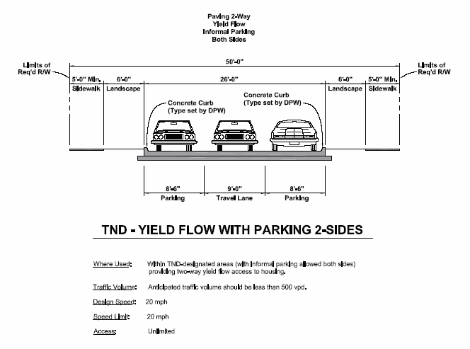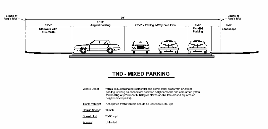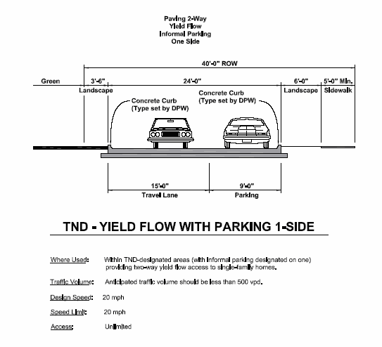 TND street cross sections are featured below. The applicant may propose additional street cross sections specific to their development with their final development plan. Any proposed street cross sections differing from those contained below shall be required to be reviewed and approved by the council.