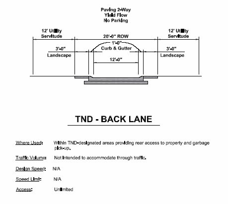 Notwithstanding the reference to a 12-foot utility servitude on the illustration above, the TND-Back Lane shall only be required to have a five-foot utility servitude on either side of the lane.
