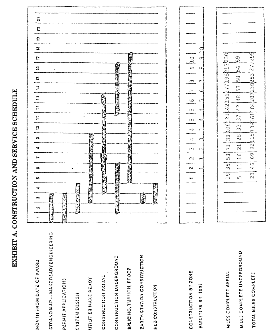 4.2 Construction Schedule. Grantee shall complete system construction and offer service to all residents in the initial service area within seventeen (17) months after the effective date of this Agreement. Grantee anticipates a period of three (3) months after the effective date of the Franchise will be sufficient to negotiate pole line attachment agreements with the utility pole owners and to acquire all necessary permits and clearances necessary to begin construction. Grantee shall complete system construction in accordance with the requirements of Exhibit A.