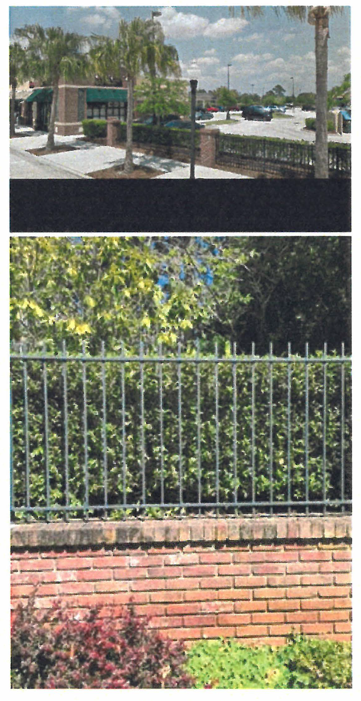 Street walls shall be constructed of wrought iron, brick, masonry, stone or other decorative materials and shall match or compliment the finishes on the building. Chain link fences shall be prohibited.