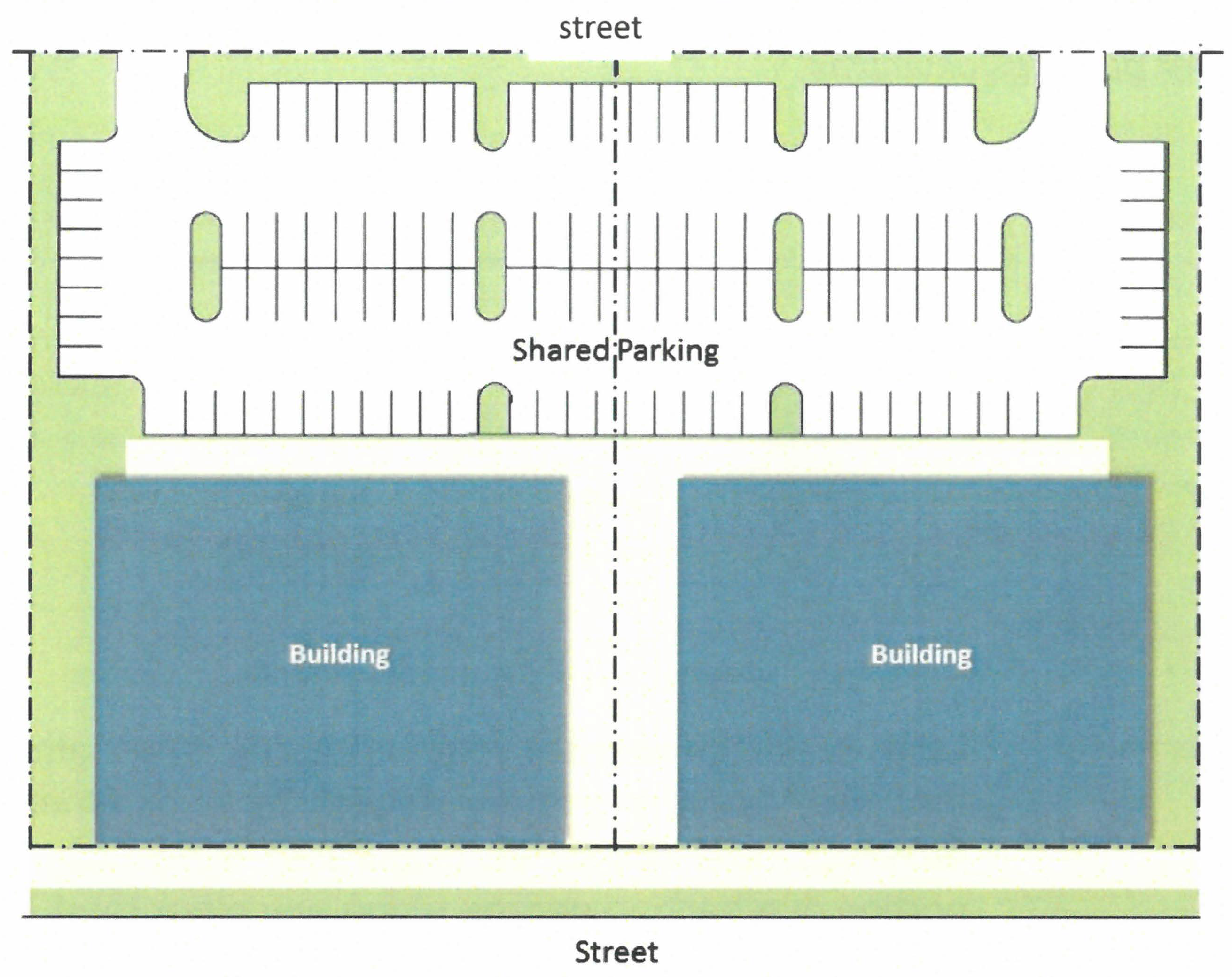 Placing parking to the side of the building is permitted only if the building frontage requirements are met. In such cases, vehicular areas along the street shall be shielded from street view by a street wall (see Figure 3).