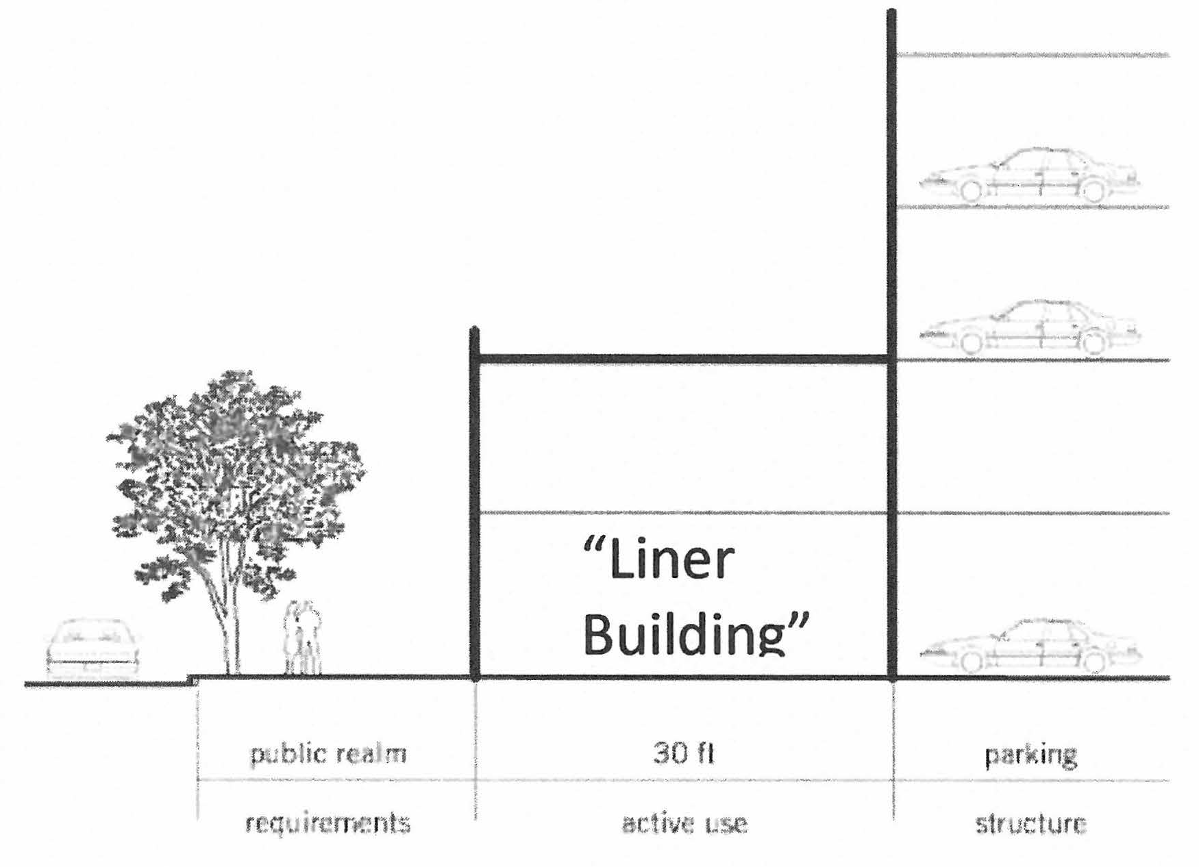If parking garages are built, these parking structures (garages) located along New Haven Avenue and Wickham Road streets shall not face directly the street, but shall instead be placed behind a primary use building (liner building), which may be attached or detached from the parking structure (see Figure 5). The liner building shall have a minimum height of two stories and a minimum depth of 30 feet along the entire length of the parking structure.