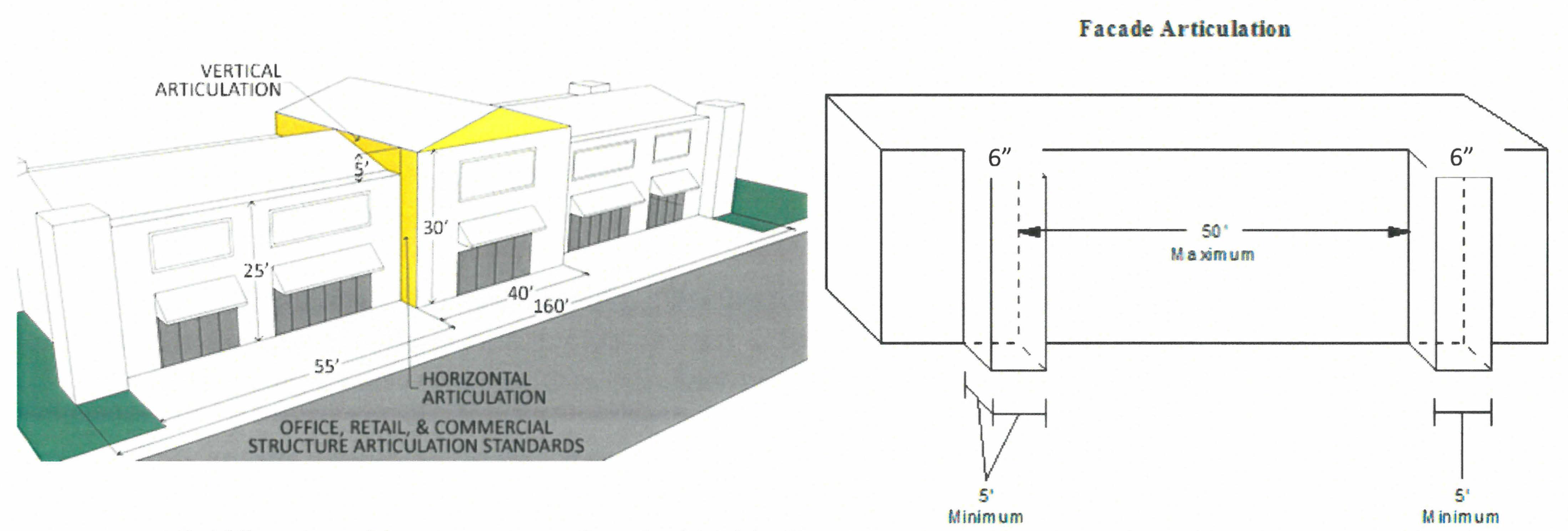 The parts that make up a building façade are key elements for defining the public realm. When properties are redeveloped or when new buildings are constructed according to this criteria, adjacent property values increase within the community redevelopment area a better work environment is provided for those employed in the numerous businesses. The façade standards in this subsection are not intended to dictate one type of style but do serve as guidelines. Parking structures shall also meet façade articulation standards applicable to the district.