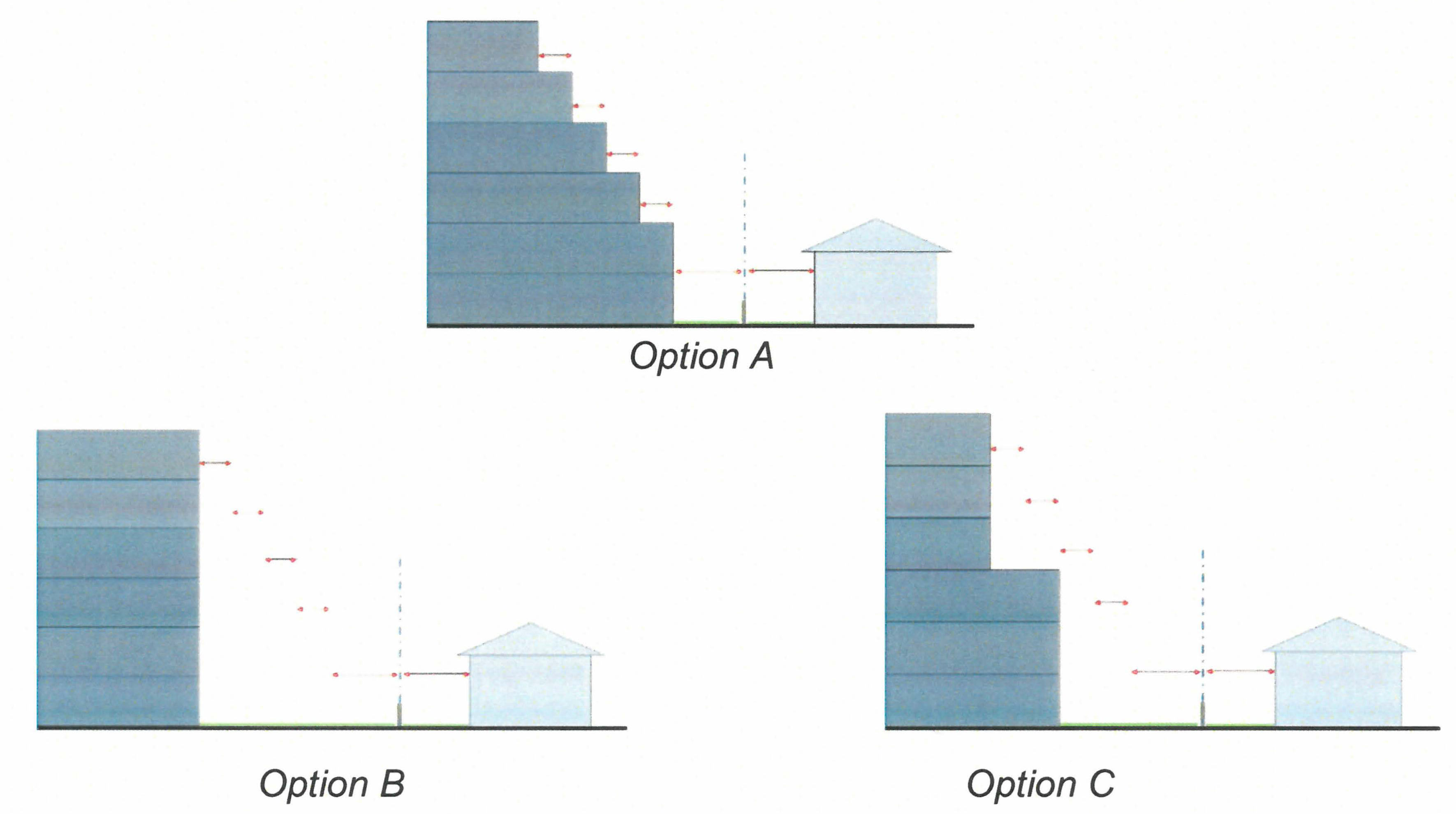 In addition, proposed non-residential buildings abutting residential zoning district(s) shall provide an additional building setback of ten feet for each floor above two stories for that portion of the building facing the residential area. Developers may elect to apply the setback just to those floors above the second/third story (step back approach, Option A), to the entire façade (Option B) or a combination of the two (Option C). See Figure 7. The additional setback/step-back for multi-story buildings may render some sites ineligible for the maximum permitted height in that district.