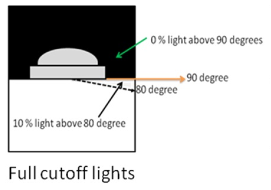 Cutoff fixture. An IES definition "Intensity at or above 90° (horizontal) no more than 2.5% of lamp lumens, and no more than 10% of lamp lumens at or above 80°."