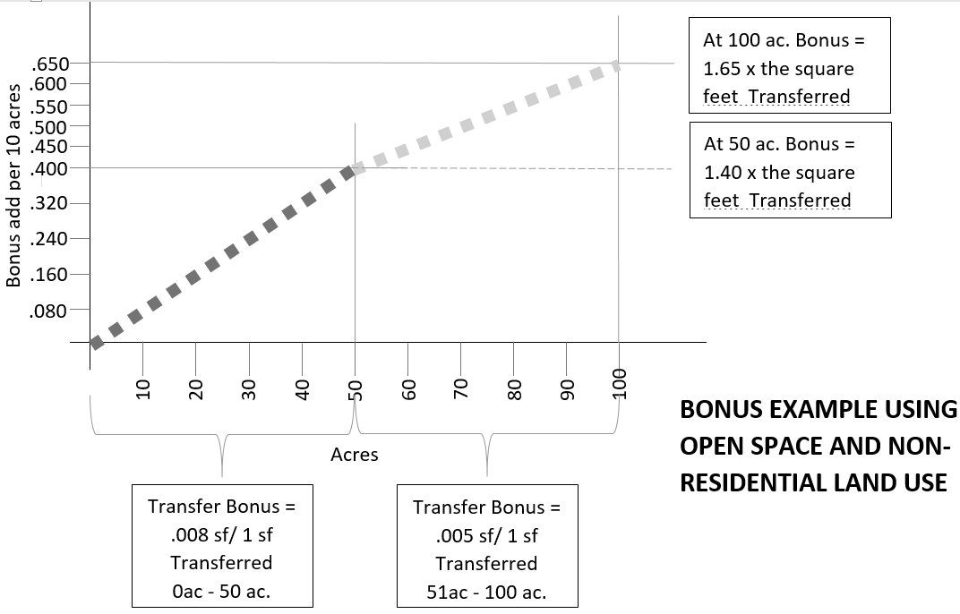Open space. For public land up to 50 ac., 0.008 sf. will be added to each square foot of severed non-residential use at transfer or .005 residential units will be added to each severed residential unit at transfer for each acre of open space.