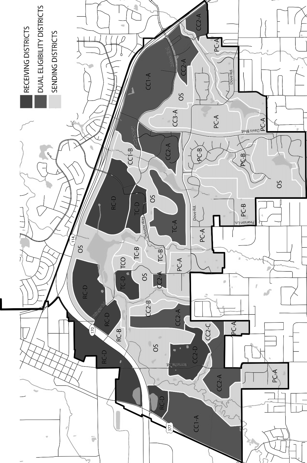 Sending districts, receiving districts, and dual eligibility districts are identified in exhibit C. When PD/PD planning area lies partially within a sending district or a receiving district or lies within a dual eligibility district, the town manager or designee shall make a recommended determination whether the entire PD/PD planning area is a sending district or a receiving district and such recommended determination shall be confirmed or modified by the town council upon approval of an application for severance or transfer. Any adjustment to the general boundaries of sending districts, receiving districts, or dual eligibility districts resulting from such recommended determinations of the town manager or designee shall be documented by making revision to exhibit C and exhibit A, when applicable, reflecting the council's final determination.
