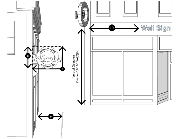Wall Sign: See Section 11-11-10(B), W.M.C. [That section states: "[a] 'wall sign' is a sign (other than a projecting sign, roof sign, skyline sign, or window sign) that (1) is fastened to or painted on the wall of a building or other structure so that the wall becomes the supporting structure for, or forms the background surface of, the sign; and (2) does not extend more than 18 inches from a building surface."]