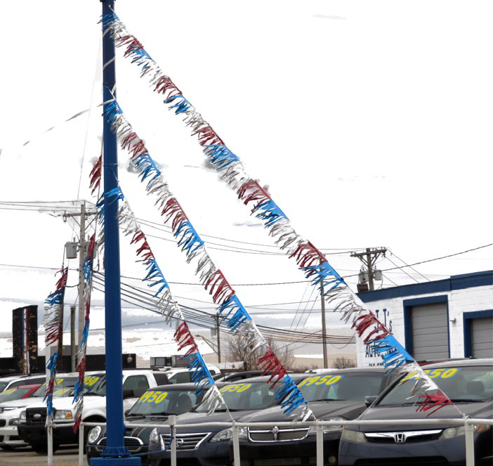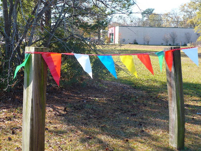 Pennant: A sign made of flexible materials that typically features a series of geometric shapes (e.g., triangles), suspended from one or two corners fastened to a string, which is secured or tethered so as to allow movement and used as an attention-getting form of media.