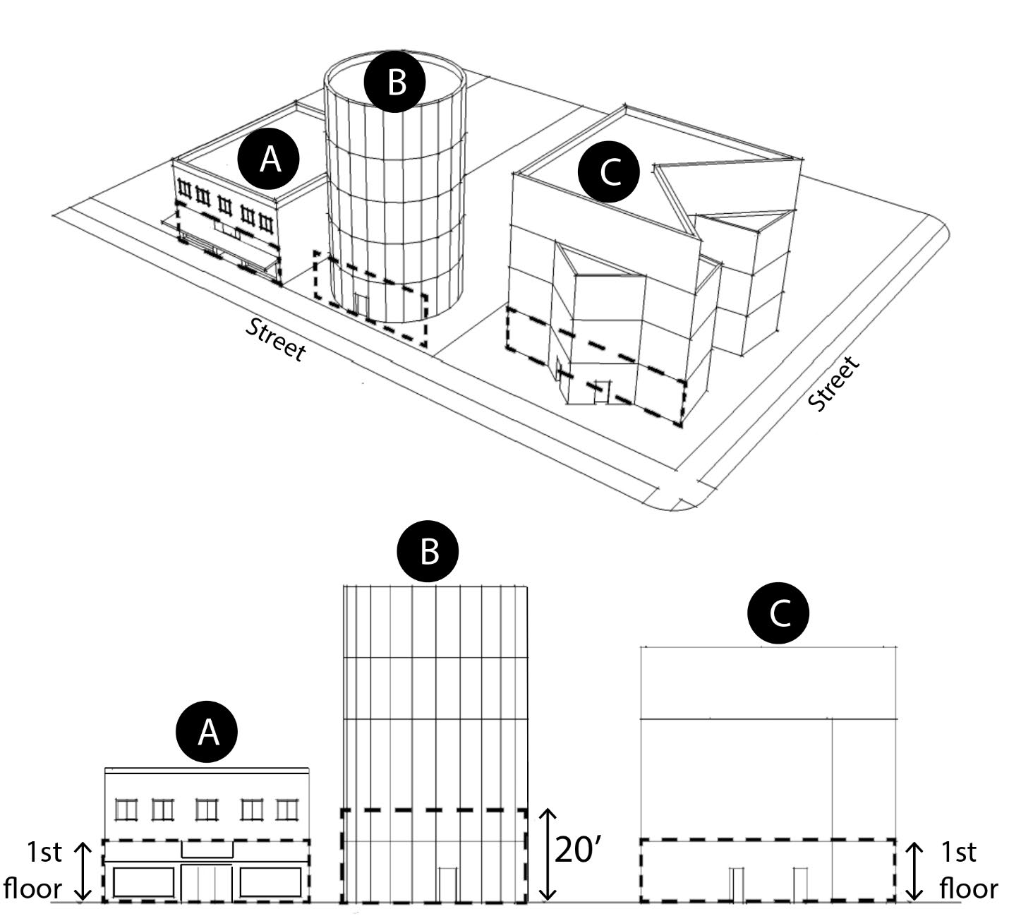 Floor Plate: The surface of a facade extending from the bottom floor to the floor above it or, if there is no floor above, to the top of the exterior wall plane.