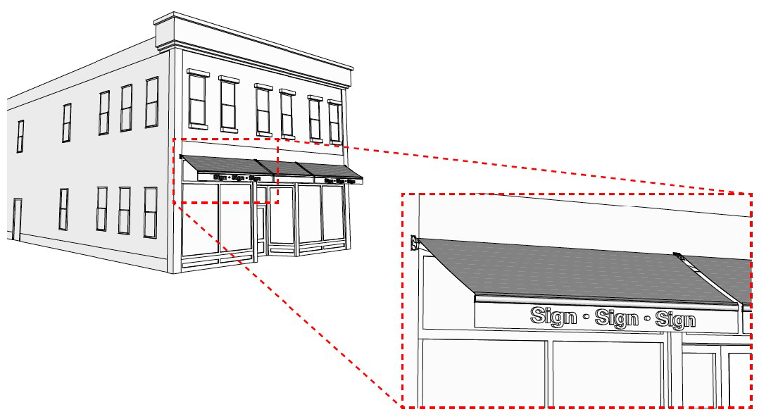 Illuminated Awning: Any awning lighted by or exposed to artificial lighting, either by lights on or in the awning, or directed toward the awning.