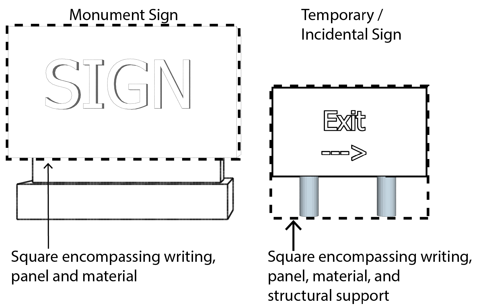 Sign Area: The entire sign face, including the advertising surface and any framing, trim, or molding, but not including the supporting structure. The sign area shall be measured as a rectangle, encompassing the largest horizontal width and largest vertical height.
