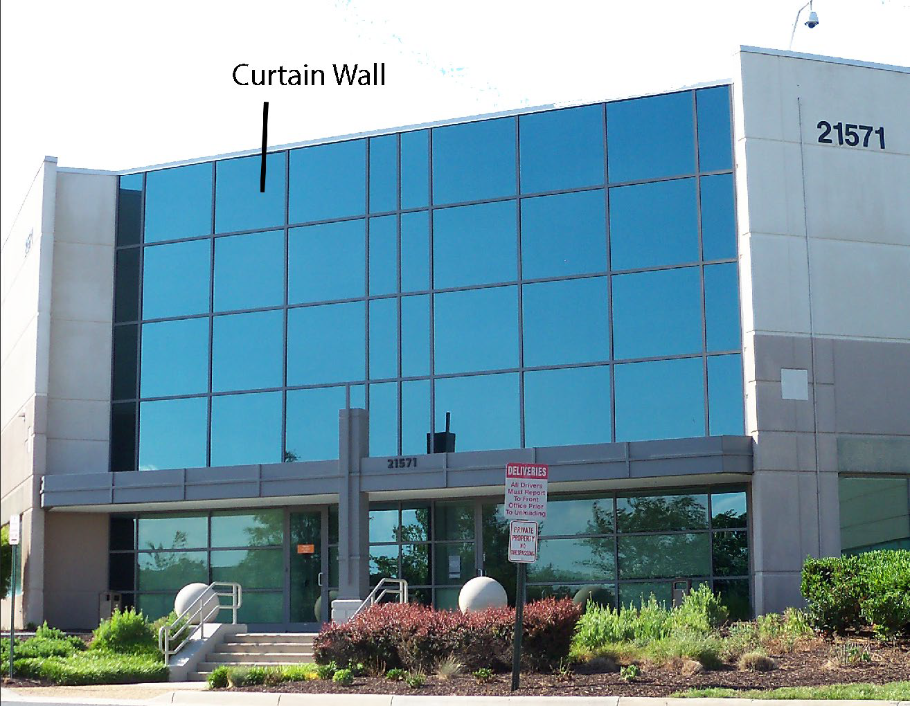 Curtain Wall: A non-load bearing exterior wall cladding that is hung on the exterior of a building, usually spanning from floor to floor.