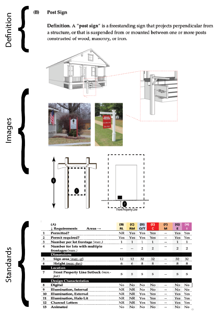 Post Sign: See Section 11-11-9(B), W.M.C. [That section states: "[a] 'post sign' is a freestanding sign that projects perpendicular from a structure, or that is suspended from or¬ mounted between one or more posts constructed of wood, masonry, iron, or similar materials."]