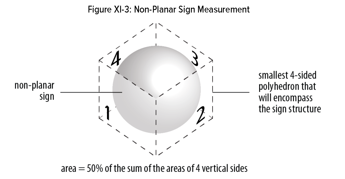Non-planar signs. Spherical, free-form, sculptural or other non-planar sign area is measured as 50 percent of the sum of the areas using only the four sides of the smallest four-sided polyhedron that will encompass the sign structure. Signs with greater than four polyhedron faces are expressly prohibited.